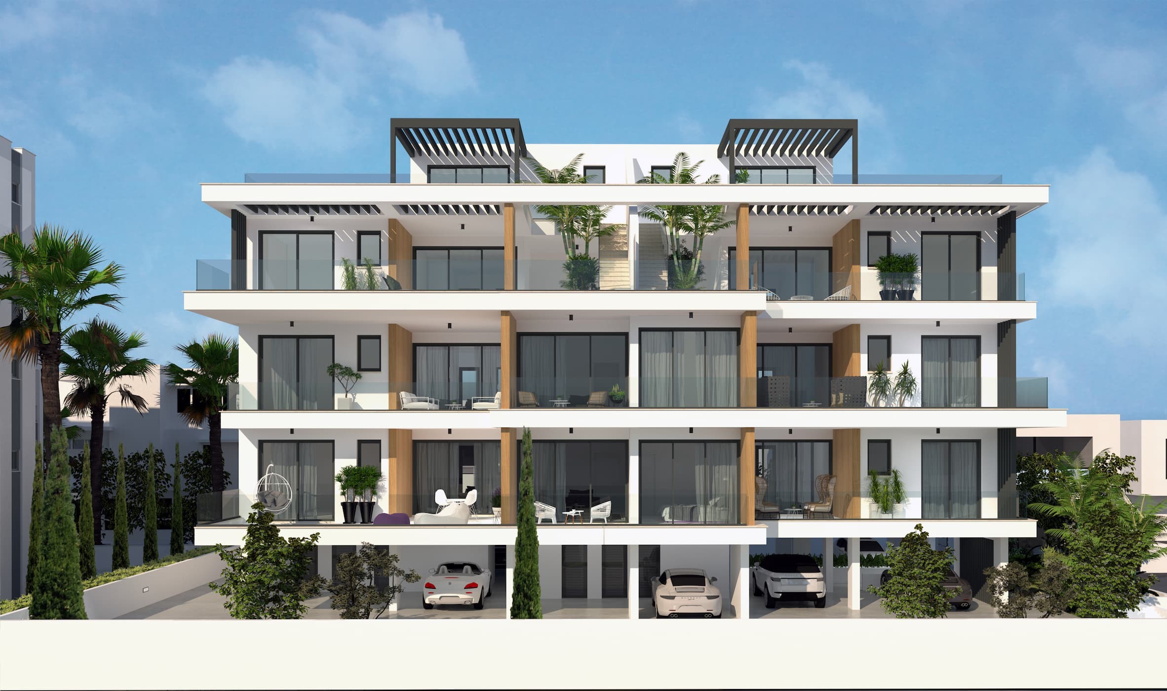 The building has elegant facades covered with alucobond with a bright shade of material. Deliberately asymmetric modulation of the openings gives the volume of the building movement and depth, emphasized by the cut of niches, which maximize the view from inside the rooms. Full height windows guarantee maximum brightness; shading and sun protection will be provided by nicely designed blinds and curtains. A very light and elegant glass railings will protect the view. The modern facade, surrounded by an alternation of transparent windows and massive metal elements, serves as the basis for the living volume above. The materials will have a great aesthetic impact and elegance: wood, metal and glass, skillfully combined with an innovative concept. Large terraces allow you to appreciate the view of the sea and full city view and enjoy privacy, away from the noise of the city.