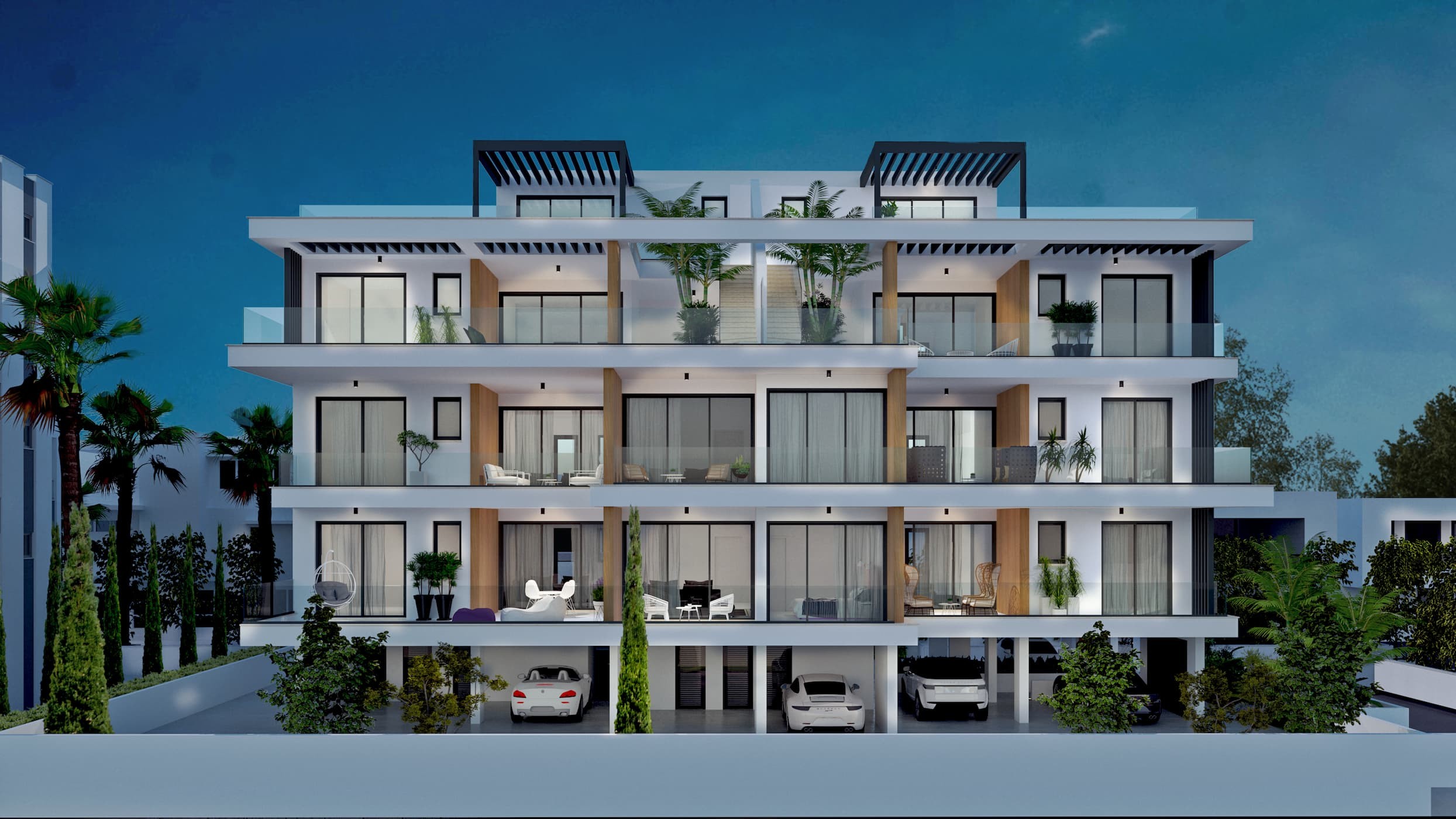 The building has elegant facades covered with alucobond with a bright shade of material. Deliberately asymmetric modulation of the openings gives the volume of the building movement and depth, emphasized by the cut of niches, which maximize the view from inside the rooms. Full height windows guarantee maximum brightness; shading and sun protection will be provided by nicely designed blinds and curtains. A very light and elegant glass railings will protect the view. The modern facade, surrounded by an alternation of transparent windows and massive metal elements, serves as the basis for the living volume above. The materials will have a great aesthetic impact and elegance: wood, metal and glass, skillfully combined with an innovative concept. Large terraces allow you to appreciate the view of the sea and full city view and enjoy privacy, away from the noise of the city.